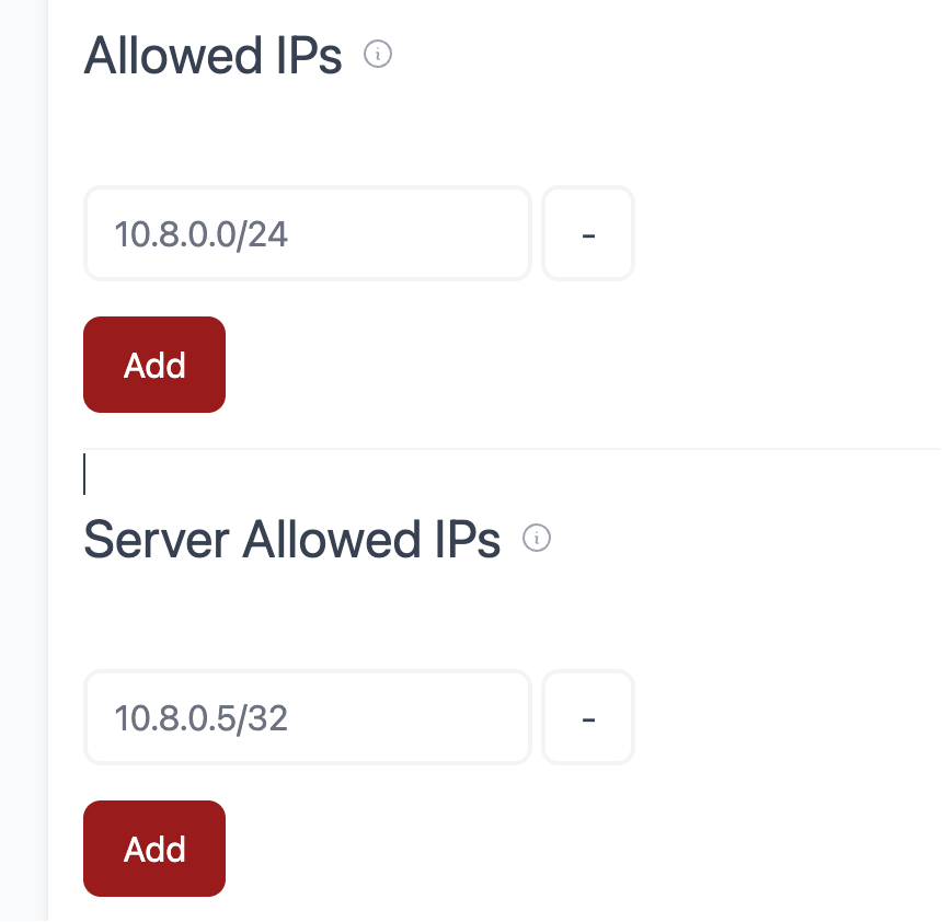 - Server Allowed IPs: single-address routes that identify this peer on the server: